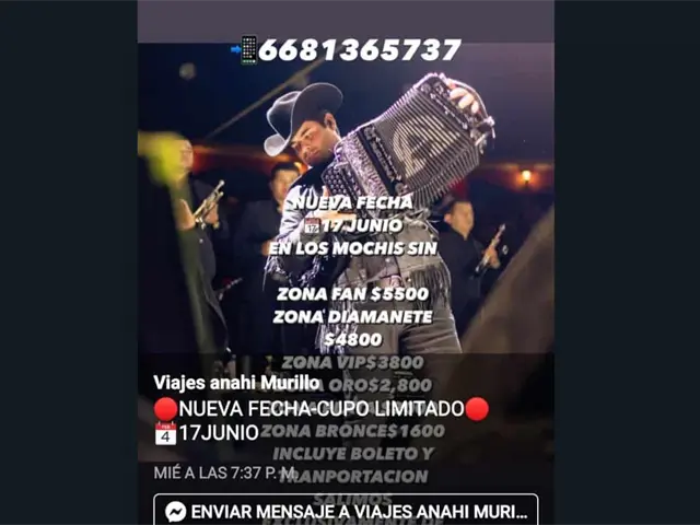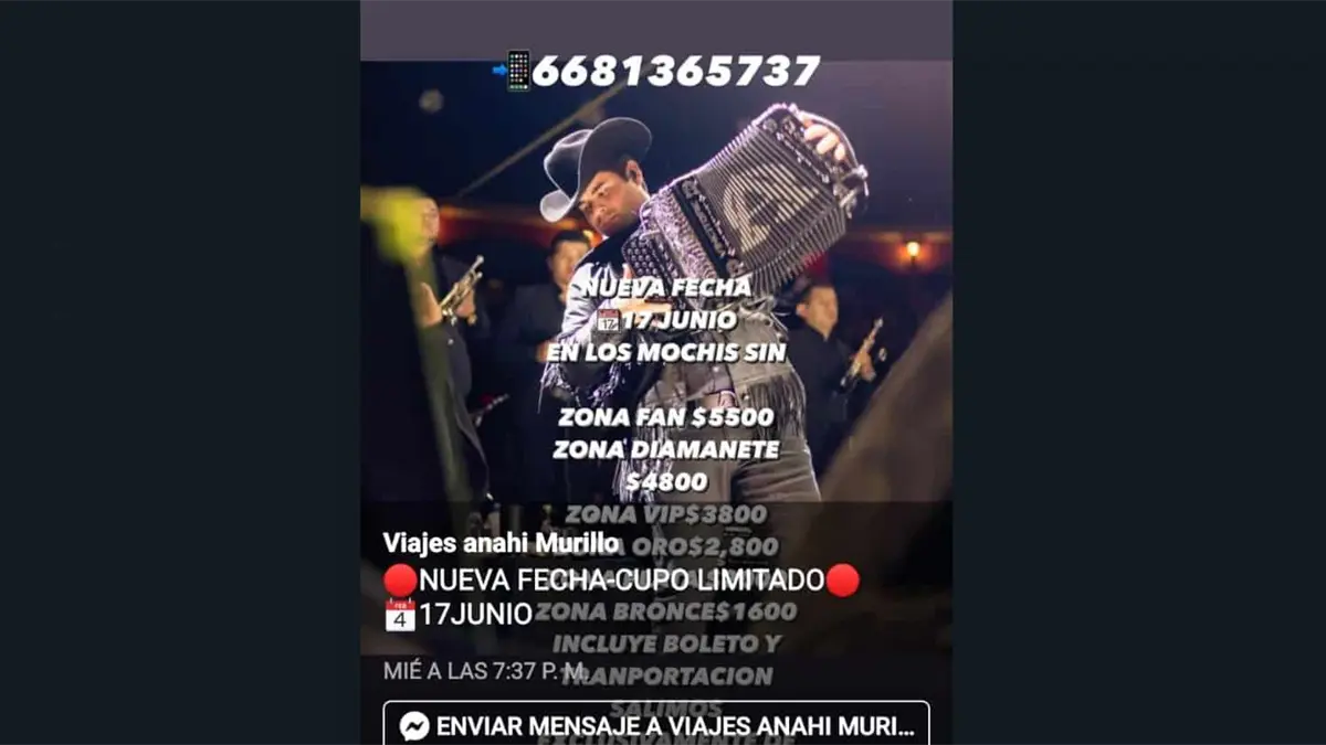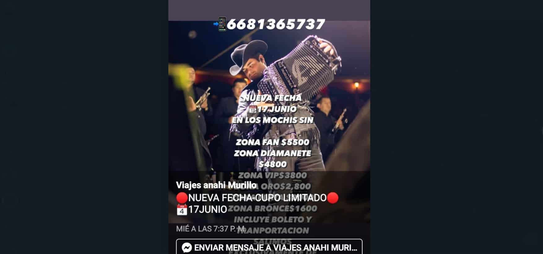 La denuncia va en contra de Viajes Anahí Murillo, que presuntamente tiene una agencia de viajes y oferta a través de redes sociales boletos y traslado desde Obregón, Navojoa y el Valle del Carrizo para que asistan al concierto.
