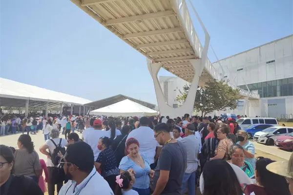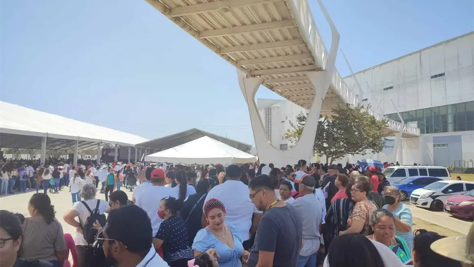 Oleadas de seguidores de Claudia Sheinbaum han arribado desde temprana hora de la mañana al Centro de Convenciones de Mazatlán. En la explanada del complejo, se colocó una techumbre para que las personas interesadas escuchen a la funcionaria.