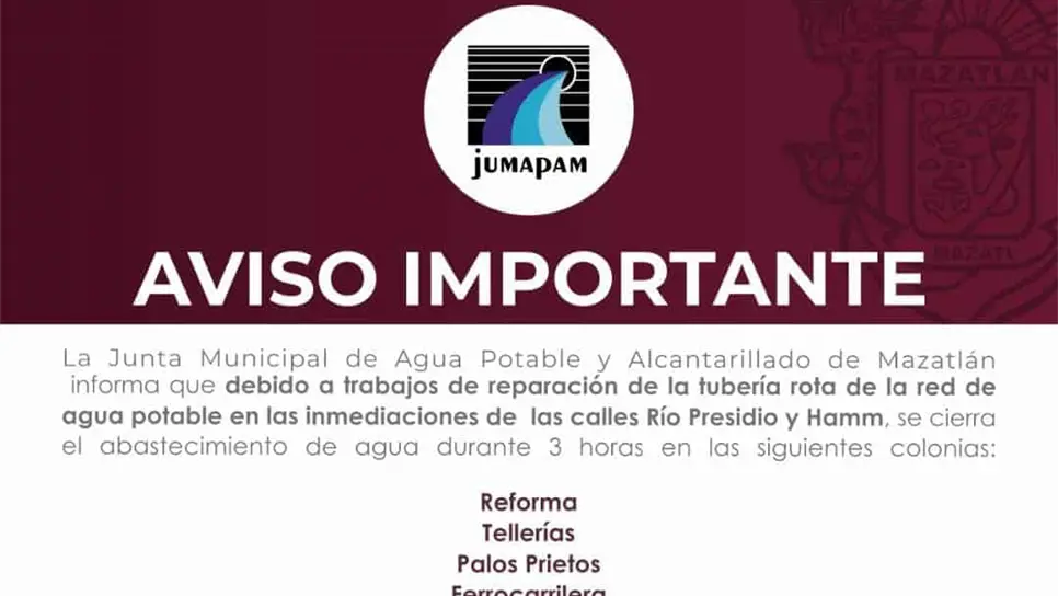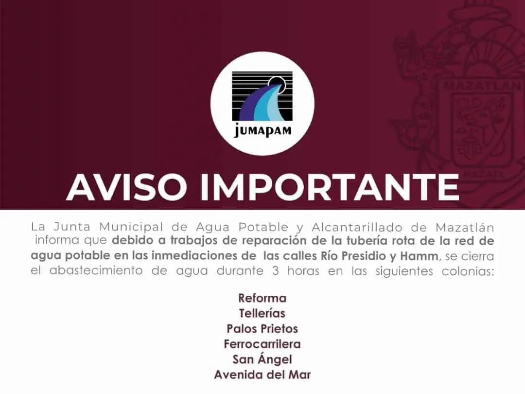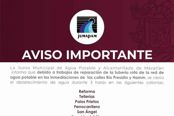 Al menos seis colonias de Mazatlán se quedarán sin el servicio de agua potable durante las próximas tres horas, ya que la Junta Municipal de Agua Potable y Alcantarillado de Mazatlán realizará trabajos de reparación de la tubería rota de la red de agua potable en las inmediaciones de las calles río presidio y Hamm.