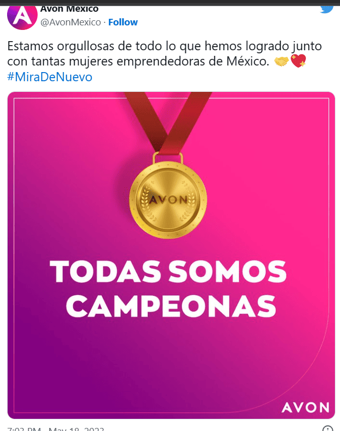 Posteriormente la empresa Avón, a través de su cuenta Avón México, publicó un tuit, en el que se señalan estar orgullosas de todo lo que han logrado junto a tantas mujeres emprendedoras de México, acompañado de la imagen de una medalla de oro, con la leyenda «Todas somos campeonas».