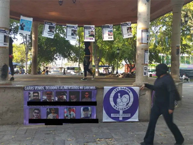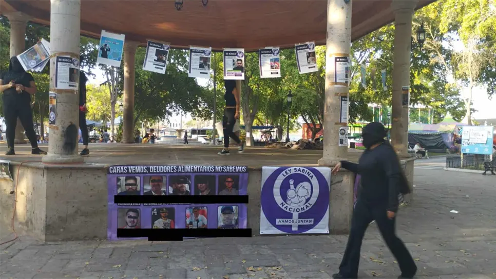 Integrantes del colectivo «Los Mochis Ley Sabina» exhibieron a padres deudores alimenticios a través de un tendedero que colocaron en la Plazuela 27 de Septiembre, donde con mantas y cartulinas dieron a conocer los nombres y rostros de algunos de los muchos hombres que han abandonado a sus hijos en el municipio de Ahome.
