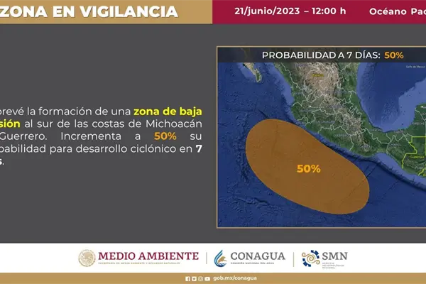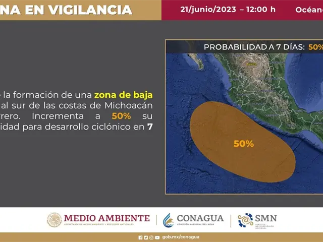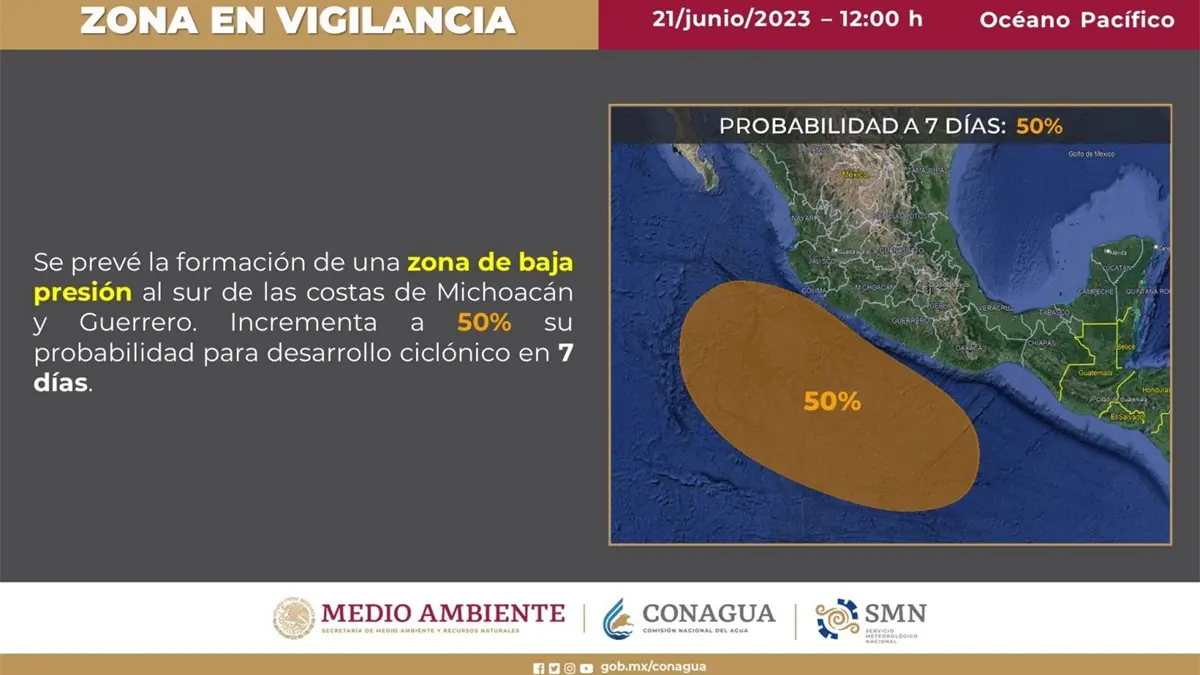 El Servicio Meteorológico Naciónal (SMN) prevé la formación de una zona de baja presión al sur de las costas de Michoacán y Guerrero, que incrementa a 50 por ciento su probabilidad para que se forme el ciclón «Adrián» en los próximos 7 días.