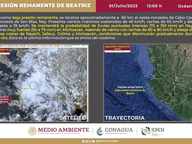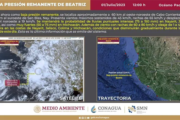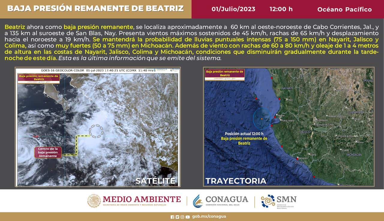 El ciclón tropical «Beatriz» se disipó en el transcurso de la mañana del 1 de julio y ahora es una baja presión remanente que se localiza a 60 km al oeste-noroeste de Cabo Corrientes, Jalisco y a 135 km al suroeste de San Blas, Nayarit, informó el Servicio Meteorológico Nacional.