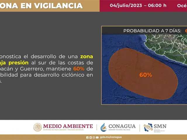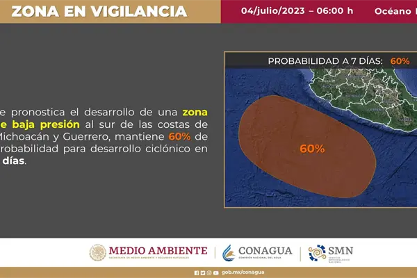 La SMN pronostica el desarrollo de una zona de baja presión al sur de las costas de Michoacán y Guerrero, manteniendo un 60 % de probabilidad para desarrollo ciclónico en los próximos 7 días.