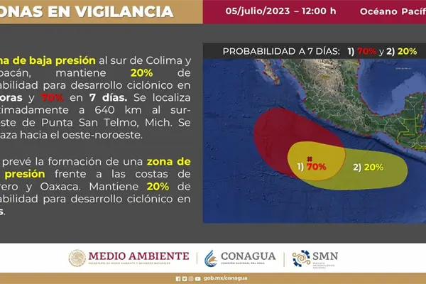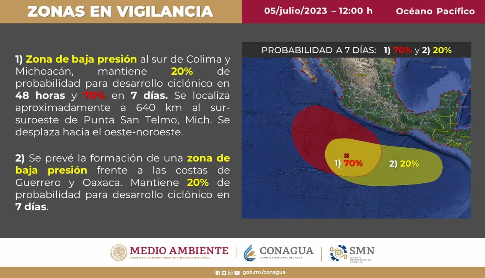 El Servicio Meteorológico Nacional (SMN) vigila dos zonas de baja presión con potencial para el desarrollo ciclónico, que pueden convertirse en los huracanes Calvin y Dora, los siguientes en la lista de esta temporada.