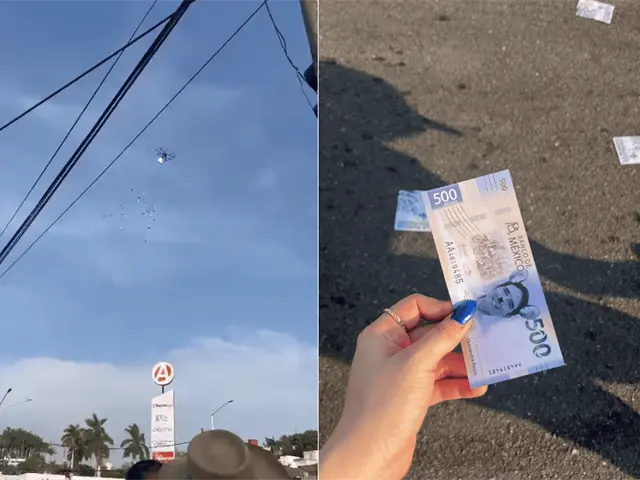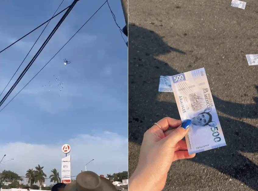 Desde el cielo, algunos drones dejaron caer los billetes a las decenas de asistentes a la marcha, los cuales se mostraron sorprendidos por esta acción.