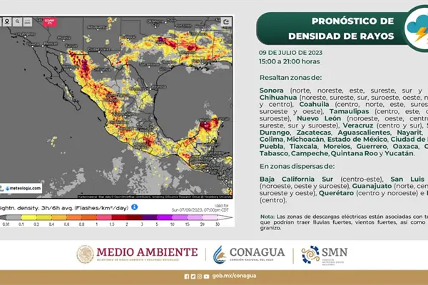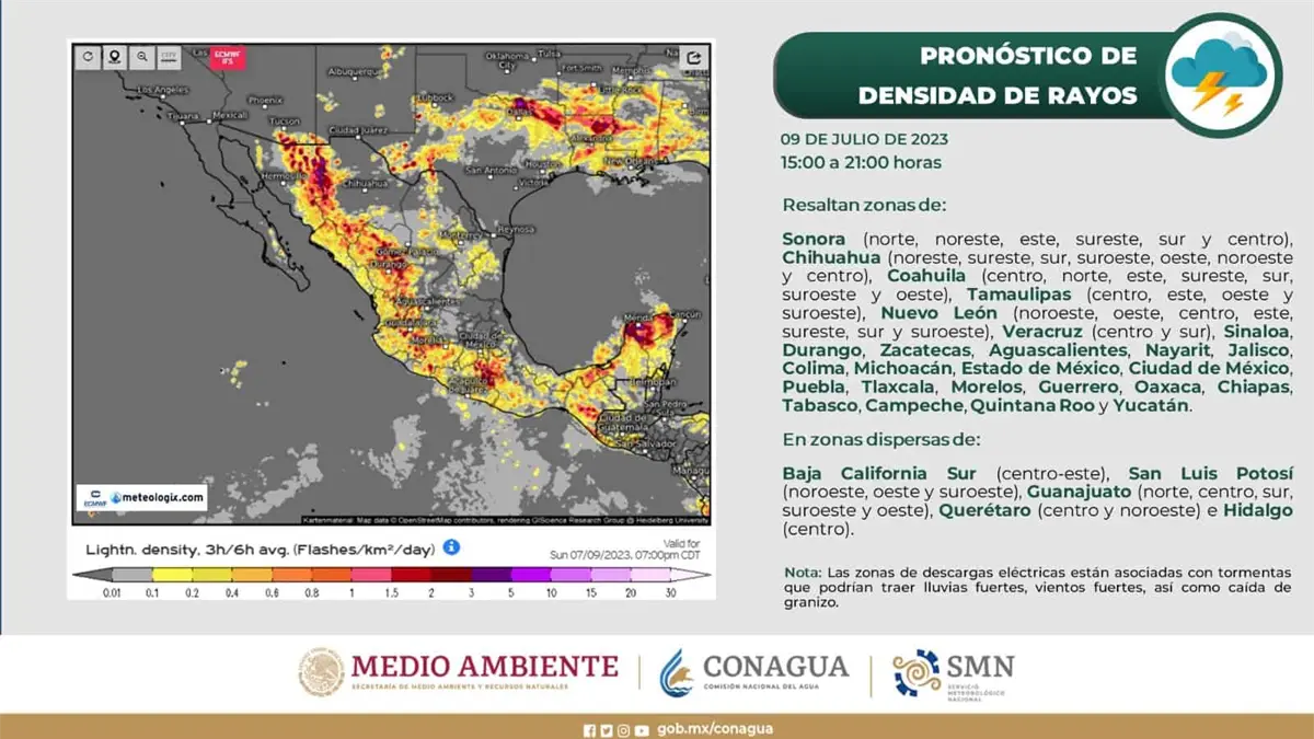 - Intervalos de chubascos con lluvias puntuales fuertes (25 a 50 mm): Baja California Sur, Sonora, Chihuahua, Zacatecas, Ciudad de México, Estado de México, Puebla, Morelos, Tabasco y Campeche.