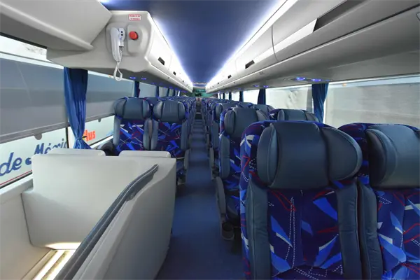 Cuenta con pantallas individuales, conexiones eléctricas, audio individual, sanitarios para hombres y mujeres, asientos confortables, aire acondicionado.