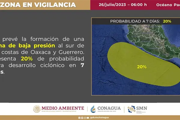 La zona de baja presión se encuentra al sur de Oaxaca y frente a las costas de Guerrero y presenta un 20 por ciento de potencial para el desarrollo ciclónico en los próximos 7 días.
