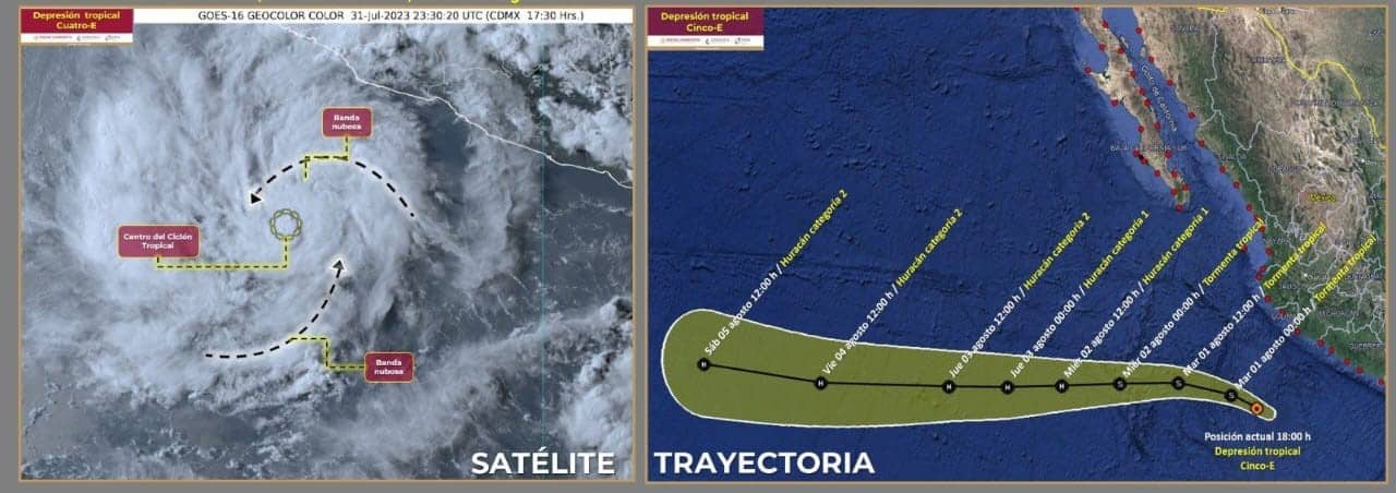 Se desarrolló en el Océano Pacífico la depresión tropical Cinco-E, que se fortalecerá para formar el huracán Dora, el cuarto fenómeno con nombre en el Océano Pacífico de la temporada de ciclones.