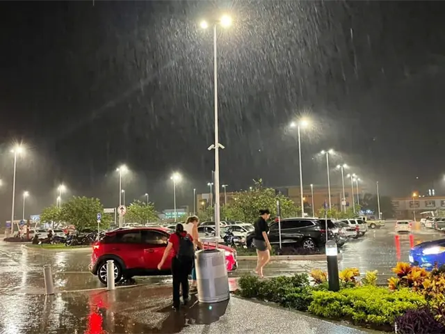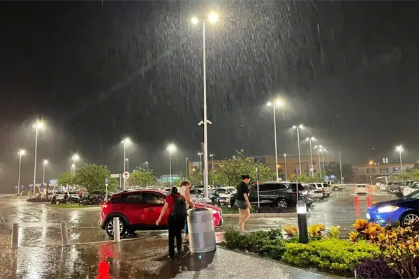 Una lluvia repentina dejó varados por algunos minutos a los visitantes de una conocida plaza comercial, ubicada en la zona de La Marina Mazatlán.