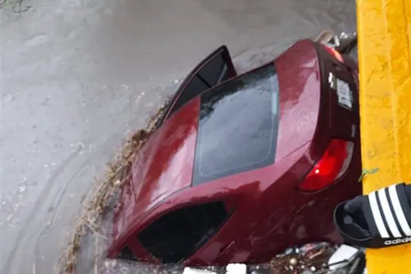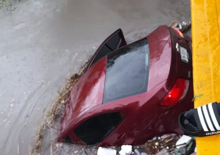El vehículo fue arrastrado por la corriente en la colonia Tierra Blanca y quedó atascado en la orilla de un puente.