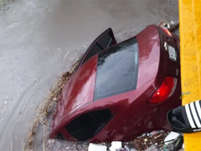 Afortunadamente los tripulantes de la unidad lograron salir por cuenta propia y llamaron a una grua para lograr sacar el vehículo que se atascó entre la basura y ramas a un costado de un puente ubicado en dicho sector.
