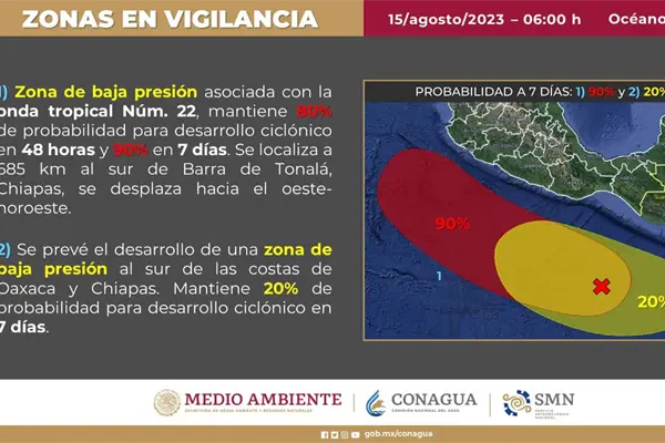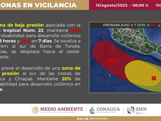 La depresión tropical se formará al sur de las costas de Oaxaca, en interacción con un canal de baja presión en el sureste mexicano, producirán lluvias fuertes a puntuales muy fuertes en el sur y sureste del país, incluida la Península de Yucatán, además de lluvias puntuales intensas en regiones de Veracruz, Oaxaca, Chiapas y Tabasco.