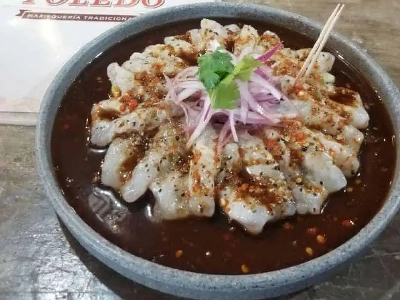 «La versión que hacemos ahí en la Toledo lleva de ingredientes camarón mariposeado, pepino en medias lunas y cebolla en juliana, cilantro y chile de árbol para decorar, limón, sal y pimienta y la salsa negra; esa yo la hago con chile habanero, serrano y chile de árbol, mezclado con soya para darle el color, no uso ninguna salsa de botella. Creo que es famoso porque en su momento fue la novedad, ya que todos estábamos acostumbrados al aguachile verde o al rojo y ya, no había más; entonces llegó el aguachile con salsa negra y a mucha gente le gustó y se volvió de los favoritos», agregó.