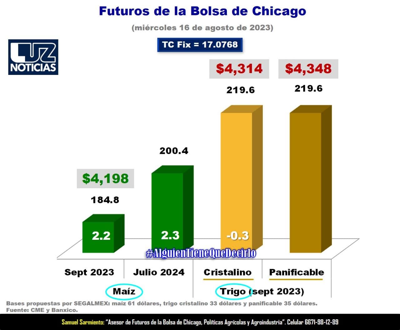 En este escenario, este miércoles, los futuros de maíz a septiembre del 2023 ganaron 2.2 dólares para ubicarse en 184.8 dólares, lo que significa un precio de referencia de $4 mil 198 por tonelada de maíz (considerando la BASE de 61 dólares propuesta por SEGALMEX), mientras que los futuros de maíz a julio del 2024 subieron 2.3 dólares para ubicarse en 200.4 dólares.