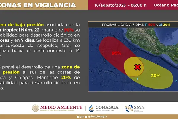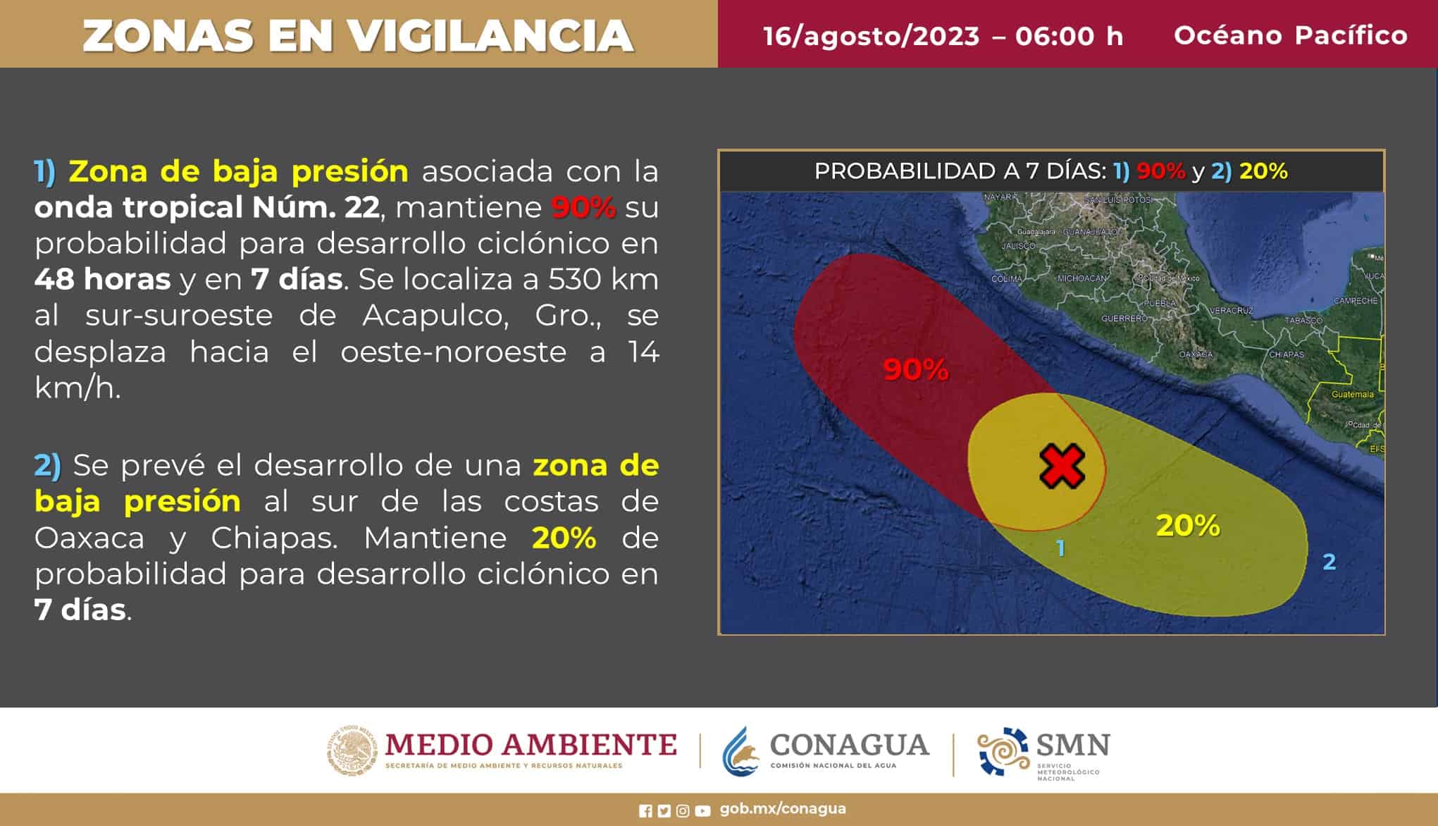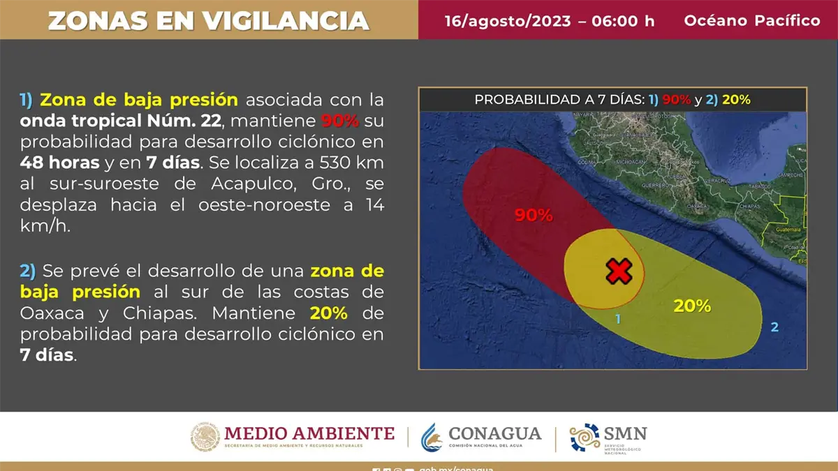 El ciclón «Hilary» estará formándose en las próximas horas según el reporte del Servicio Meteorológico Nacional (SMN), se mantiene la vigilancia por la asociación con la onda tropical número 22 que tiene una probabilidad para formarse en las siguientes 48 horas del 90 por ciento.