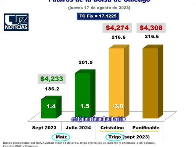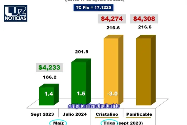 En este escenario, este jueves, los futuros de maíz a septiembre del 2023 ganaron 1.4 dólares para ubicarse en 186.2 dólares, lo que significa un precio de referencia de $4 mil 233 por tonelada de maíz (considerando la base de 61 dólares propuesta por SEGALMEX), mientras que los futuros de maíz a julio del 2024 subieron 1.5 dólares para ubicarse en 201.9 dólares.