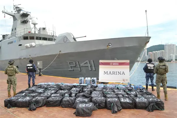 Esta acción se llevó a cabo tras efectuar patrullajes de vigilancia marítima con una Patrulla Oceánica de la Armada de México, localizando una embarcación menor con dos motores fuera de borda, a aproximadamente 194 millas náuticas (359 kilómetros) al Sureste del puerto de Acapulco, Guerrero, con tres tripulantes a bordo, logrando el aseguramiento de la presunta droga y combustible, distribuido en diferentes contenedores.