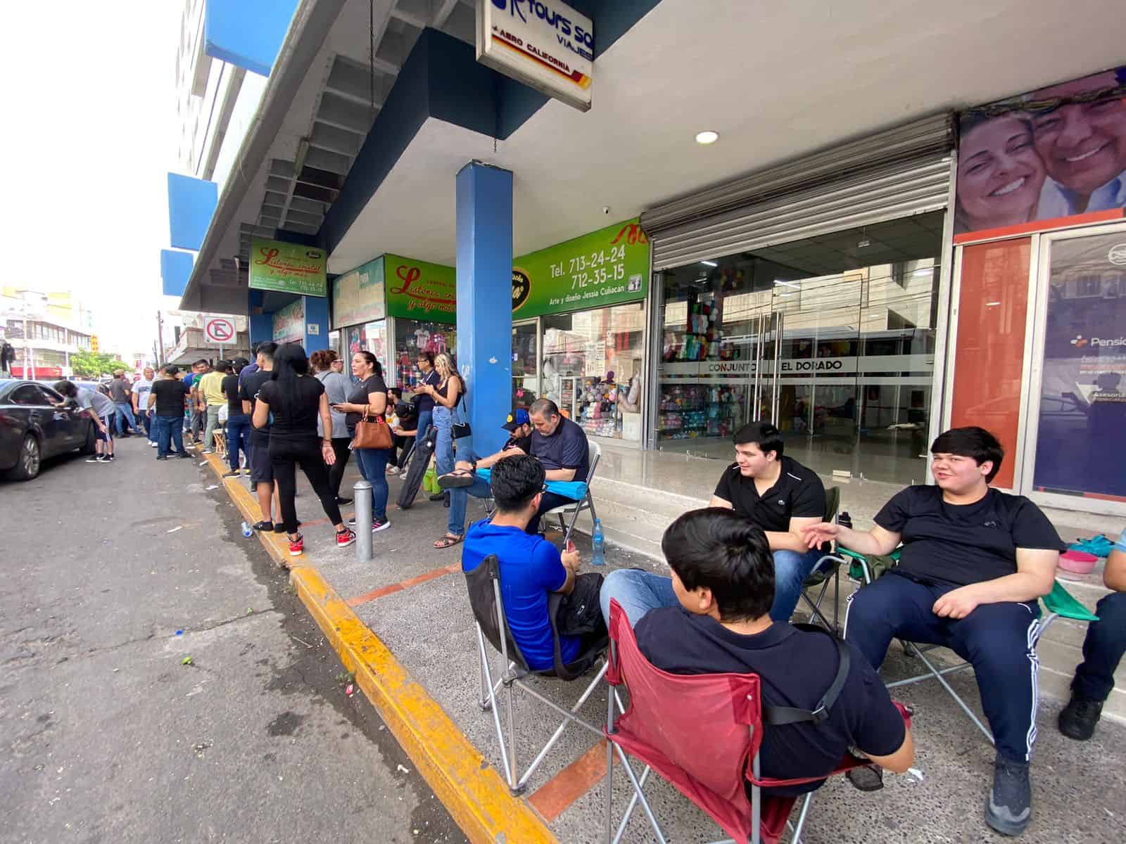 Largas filas se registraron por horas en las afueras del Hotel San Marcos en Culiacán para comprar los boletos del Palenque 2023. Aunque la venta inició en punto de las 10:00 de la mañana, a algunas personas les ganó el desespero y emoción y desde la noche del 18 de agosto llegaron con sus sillitas plegables para apartar su turno.