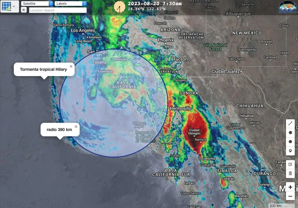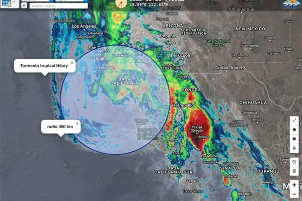 El fenómeno meteorológico Hilary perdió fuerza y ahora es una tormenta tropical que se ubica a 80 kilómetros al Sur de San Quintín, Baja California, con vientos máximos de 110 kilómetros por hora y presenta rachas de 130 kilómetros por hora.