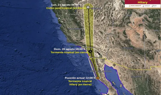 De acuerdo al Servicio Meteorológica Nacional, La tormenta tropical Hilary se localiza en tierra, en las inmediaciones del municipio de Cabo San Quintín, BC.
