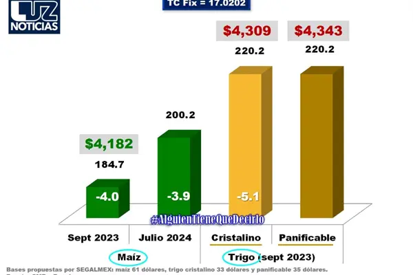 Por otra parte, los futuros de trigo a septiembre del 2023 perdieron 5.1 dólares para ubicarse en 220.2 dólares, lo que significa un precio de referencia de $4 mil 309 por tonelada de trigo cristalino y de $4 mil 343 por tonelada de trigo panificable (considerando las BASES de 33 y 35 dólares propuestas por SEGALMEX para Sinaloa).