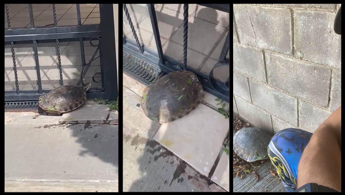 Vecinos de la colonia Valle Bonito encontraron una tortuga caminando en las calles después de las lluvias que se registraron el pasado fin de semana por remanentes del huracán «Hilary».