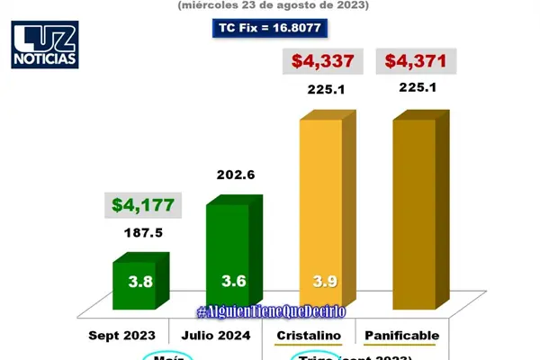 En este escenario, este miércoles los futuros de maíz a septiembre del 2023 ganaron 3.8 dólares para ubicarse en 187.5 dólares, lo que significa un precio de referencia de $4 mil 177 por tonelada de maíz (considerando la BASE de 61 dólares propuesta por SEGALMEX), mientras que los futuros de maíz a julio del 2024 subieron 3.6 dólares para ubicarse en 202.6 dólares.