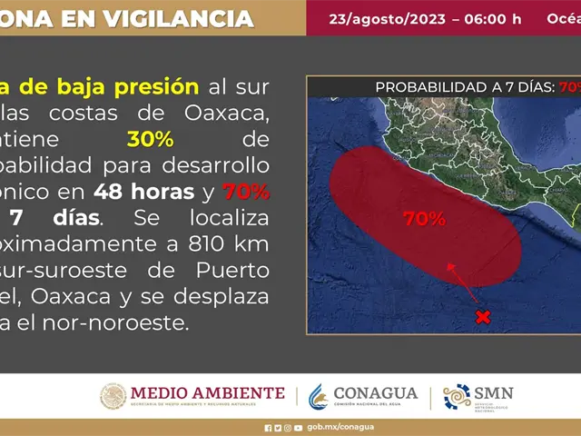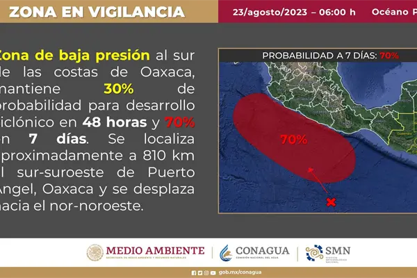 De acuerdo al SMN, la zona de baja presión se encuentra al sur de Oaxaca, mantiene un 30 por ciento de probabilidades para desarrollo ciclónico en las próximas 48 horas y un 70 % para hacerlo en los próximos 7 días, por lo que podría coincidir con el regreso a clases.