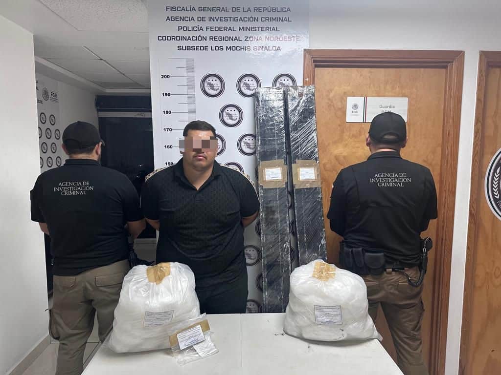 Elementos de la Policía Federal Ministerial (PFM), de la Fiscalía General de la República (FGR), decomisan en un punto de revisión provisional instalado en el Valle del Carrizo, paquetes con 16 kilos de metanfetamina que iban ocultos en un tractocamión de Sinaloa hacia la frontera con Estados Unidos.