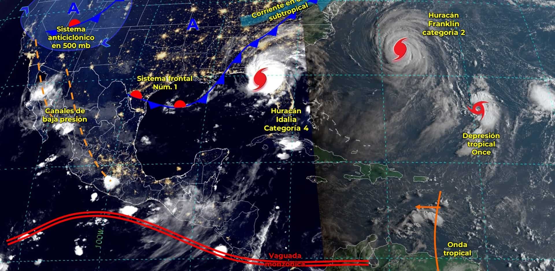 Para hoy, el monzón mexicano mantendrá las condiciones para lluvias fuertes a muy fuertes acompañadas de descargas eléctricas en el noroeste mexicano, incluida la Península de Baja California.