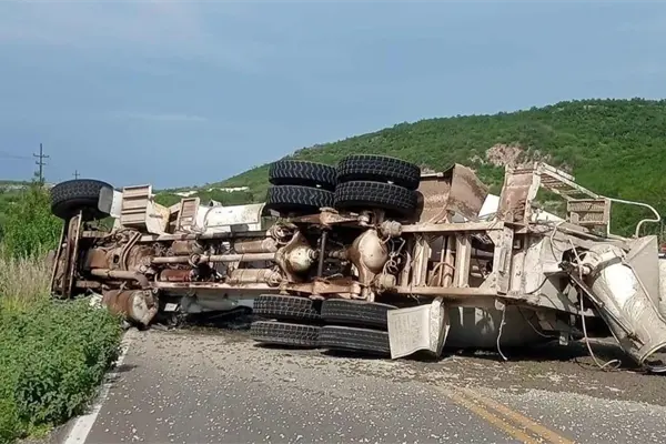Según informes, el accidente ocurrió a unos metros de un conocido motel al norte de Guamúchil, donde una unidad revolvedora que transportaba cemento quedó volcada sobre la cinta asfáltica, después del impacto por causas desconocidas contra una camioneta que quedó con el frente destruido.