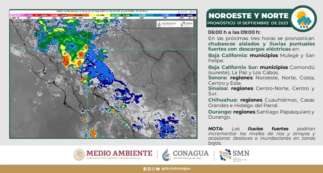 La temporada de lluvias sigue afectando a México y a Sinaloa, pues de acuerdo al Sistema Meteorológico Nacional (SMN), para este viernes 1 de septiembre se pronostican chubascos aislados y lluvias puntuales fuertes con descargas eléctricas en el estado.