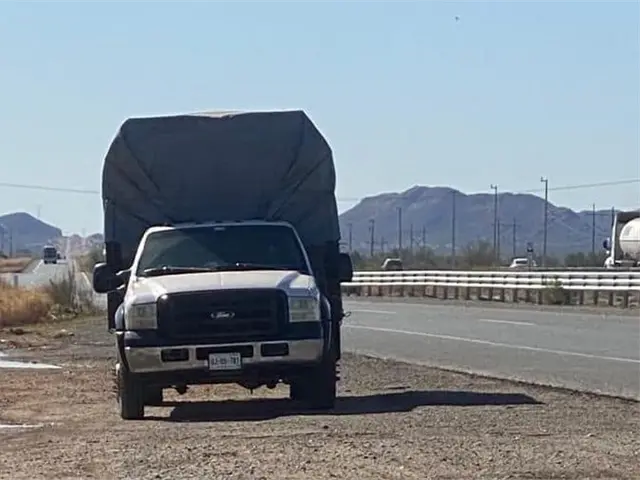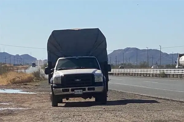 Se trata de una camioneta Diesel 4x4, doble rodada y con redilas altas tipo ganadera, de la marca Ford, modelo 2006, con placas de circulación UJ-85-781 del estado de Sinaloa, a nombre de Pedro Beltrán Quintero.