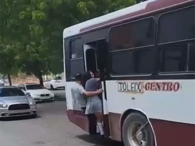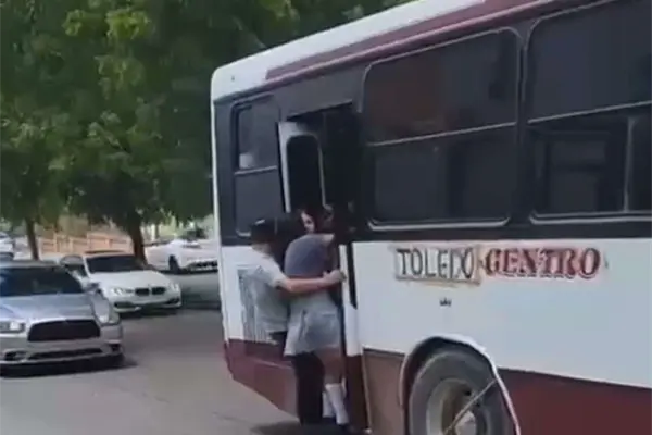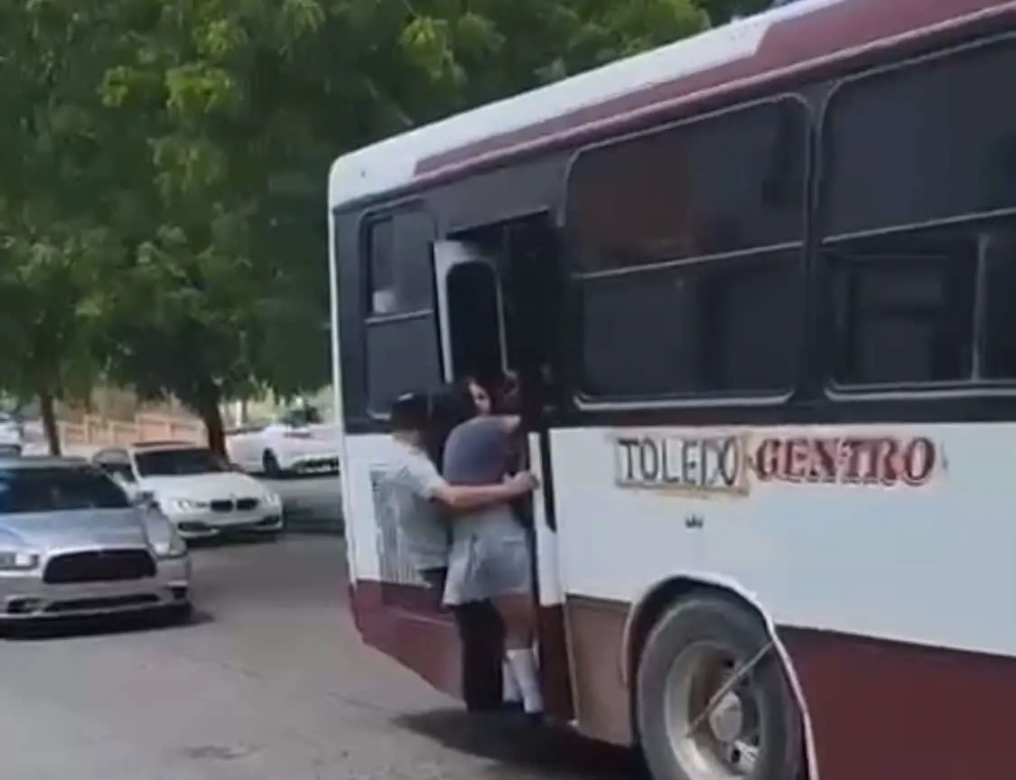 En un video que circula a través de redes sociales, se aprecia cómo un camión de la ruta Toledo lleva a estudiantes de preparatoria en el filo de las escaleras de la puerta trasera.