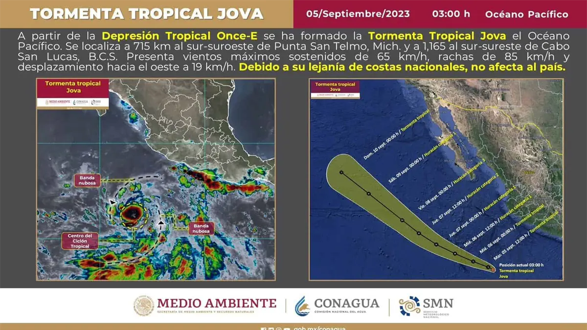 De acuerdo con información de Protección Civil Estatal, la madrugada de este martes se formó la tormenta tropical «Jova», su centro se ubicó a mil 165 kilómetros al sur-sureste de Cabo San Lucas, su circulación reforzará el flujo de humedad hacia Sinaloa, lo que propiciará las condiciones de lluvia para esta semana.