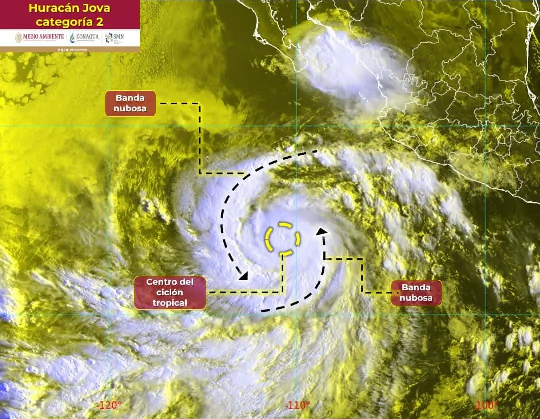 «Jova se ha intensificado a huracán categoría 2 en la escala Saffir-Simpson, su circulación refuerza la probabilidad de lluvias muy fuertes a intensas en el occidente y sur del país, originando rachas de viento y oleaje elevado en costas de Jalisco, Colima y Michoacán», advirtió la dependencia federal.