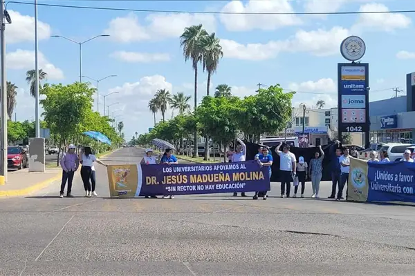 Maestros y personal administrativo de la Unidad Regional Norte de la Universidad Autónoma de Sinaloa (UAS), bloquearon por más de una hora el crucero del bulevar Adolfo López Mateos y Juan de Dioz Batiz en exigencia de que se detenga la actual persecución política que enfrentan el rector, Jesús Madueña Molina y otras autoridades de la institución.