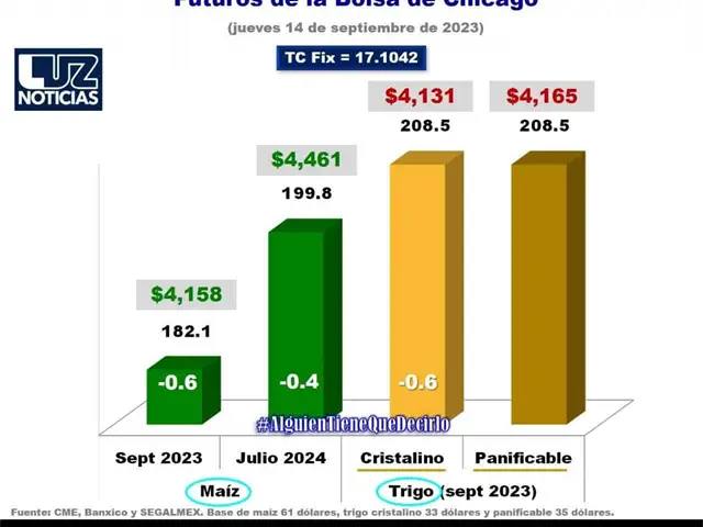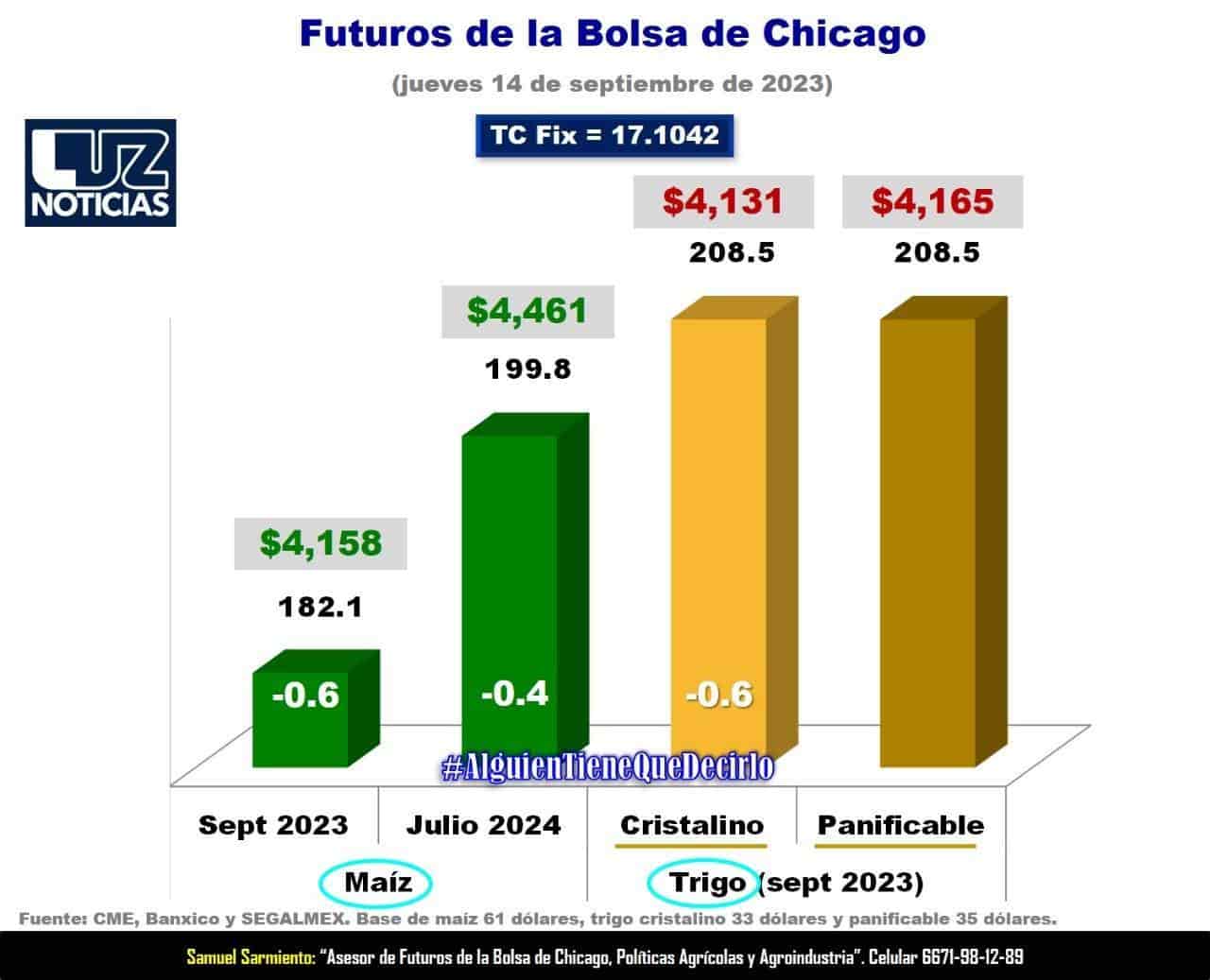 Por otro lado, los futuros de trigo para septiembre de 2023 también sufrieron una reducción de 0.6 dólares, llegando a 208.5 dólares por tonelada. Esto se traduce en un precio de referencia de $4,131 por tonelada de trigo cristalino y $4,165 por tonelada de trigo panificable, considerando las bases de 33 y 35 dólares propuestas por SEGALMEX para Sinaloa.
