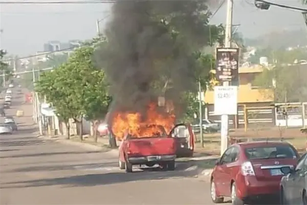 La unidad que terminó calcinada es una camioneta Ford de color rojo con placas del estado de Sinaloa, la cual fue consumida por el incendio.