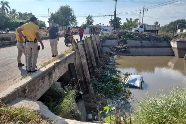 El accidente se dio cuando Carlos Geovanny conducía un Nissan March modelo 2021 por un costado de la entrada principal de El Diez, y al llegar al canal donde están las compuertas perdió el control para después terminar en la obra hidráulica.