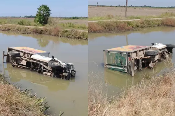 Camión cargado de botellas de té termina en un canal de riego en Guasave