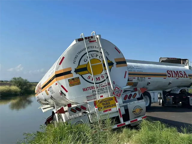 La segunda cisterna se soltó y terminó con los neumáticos dentro de la obra hidráulica, mientras que la primera quedó atravesada en ambos carriles de la carretera estatal antes mencionada.