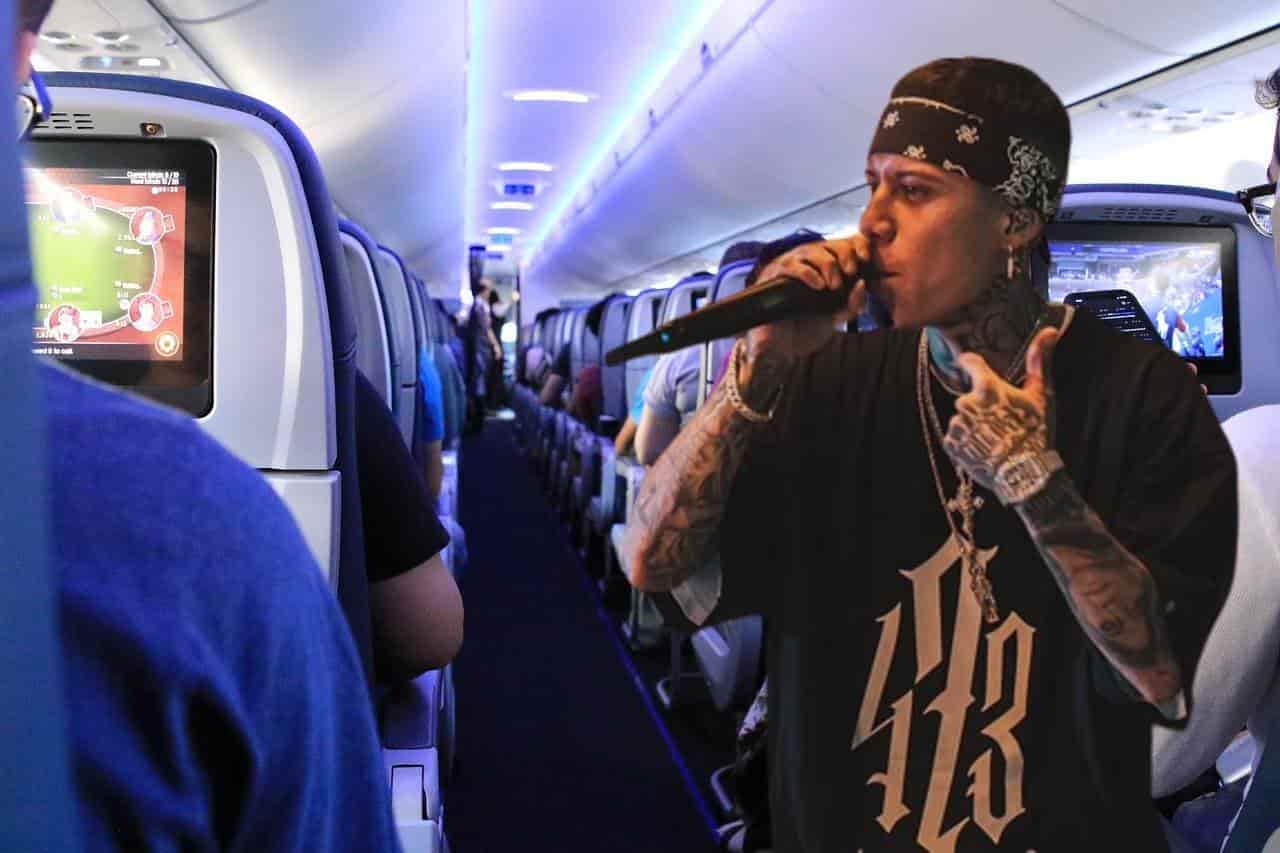 Óscar pidió a una sobrecargo que le entregara una cerveza al rapero, y segundos después, Santa Fe Klan asomó la cabeza desde su asiento en el pasillo para agradecer el gesto.