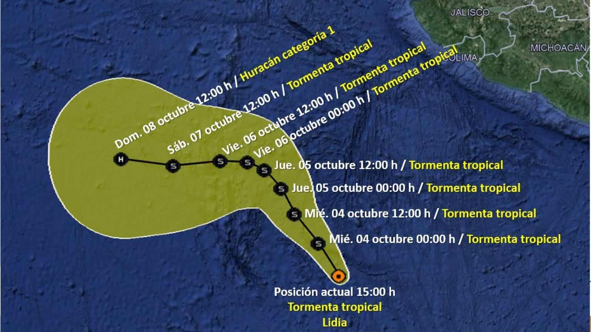 La tormenta tropical Lidia, que se formó durante la madrugada de este martes 3 de octubre en el Océano Pacífico, al sur de las costas de Michoacán y Colima, continúa su trayectoria hacia el noroeste a 13 km/h.