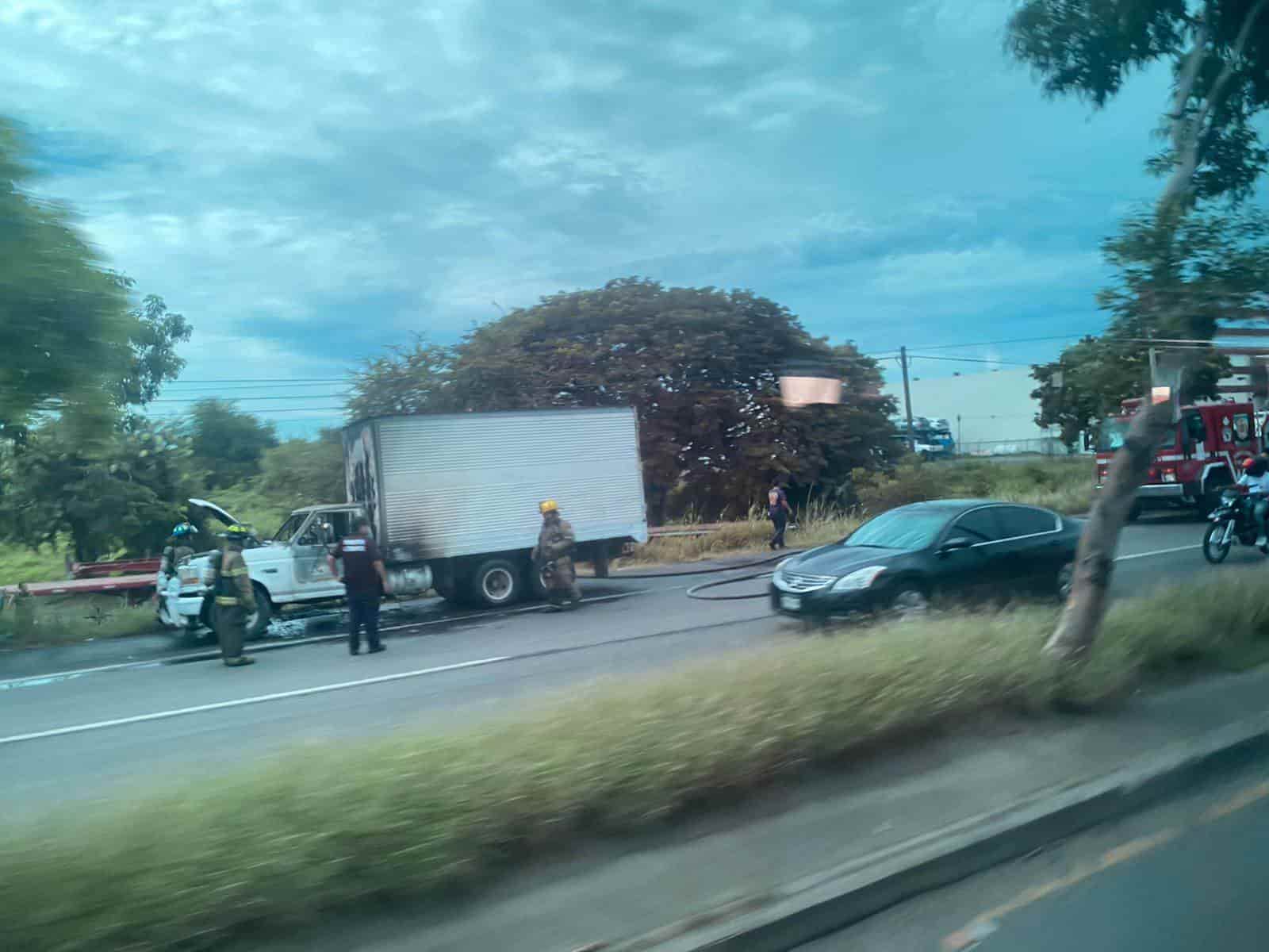 Debido a problemas eléctricos, una camioneta con caja refrigerada ardió en Mazatlán, a la altura de conocido motel ubicado en la salida sur del puerto, lo que ocasionó que el motor de la unidad fuera consumido por las llamas.