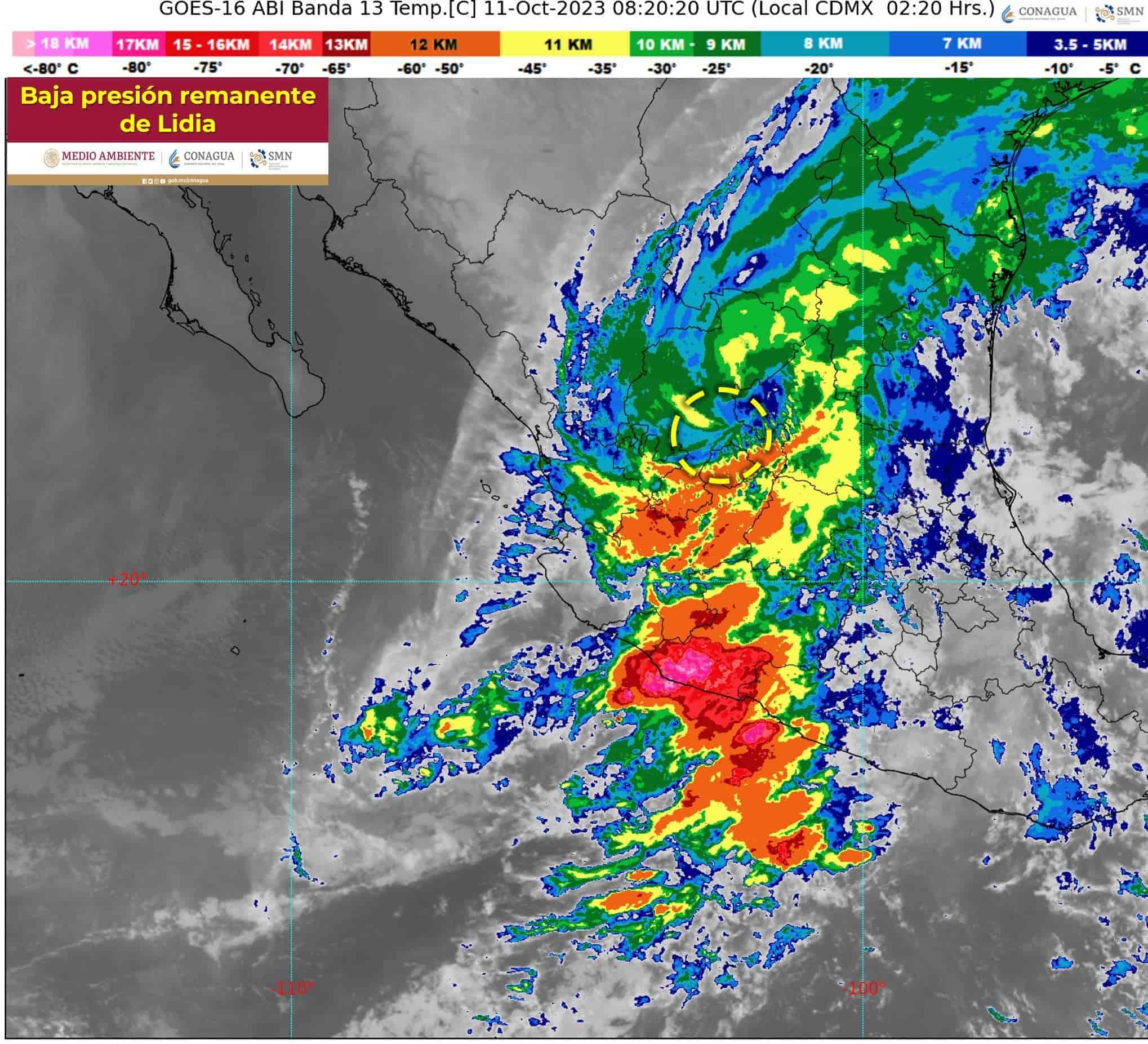 Después de haberse impactado y al seguir trasladándose hacia el centro de la república, «Lidia» se ha debilitado en tierra a baja presión remanente, al sur-sureste de Zacatecas, provocando interacción con la corriente en chorro subtropical, así lo dio a conocer el Sistema Meteorológico Nacional (SMN).