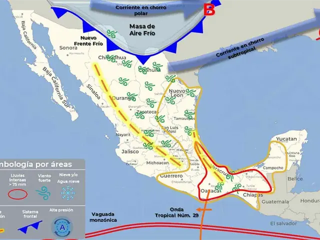 Paralelamente, se prevé que la onda tropical 29 se desplace lentamente por el sureste y sur de México, generando chubascos y lluvias fuertes en estas regiones, con precipitaciones muy intensas en estados como Oaxaca y Chiapas debido a su interacción con un canal de baja presión y una vaguada monzónica.