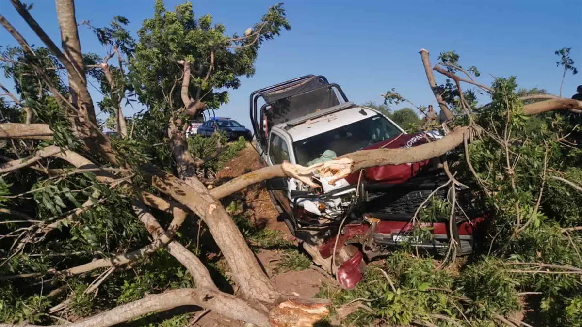 Tras la salida de camino, la patrulla se impactó contra un árbol que se encuentra a un costado de la carretera, la unidad terminó con severos daños al frente y sobre el cofre en medio de un predio agrícola.
